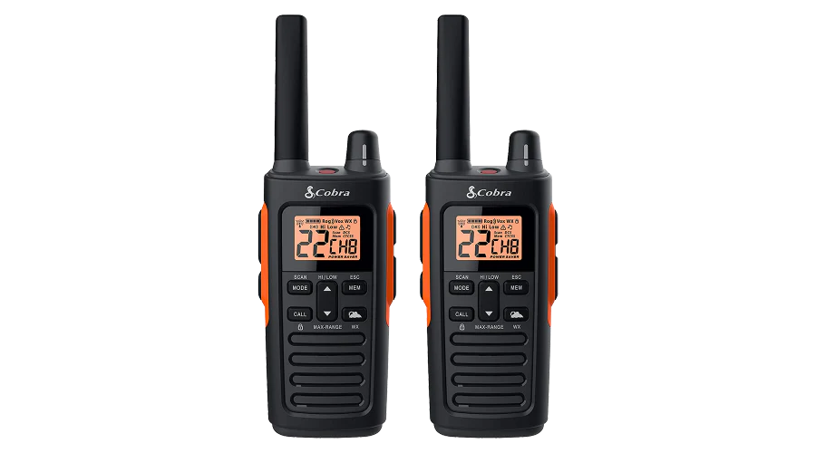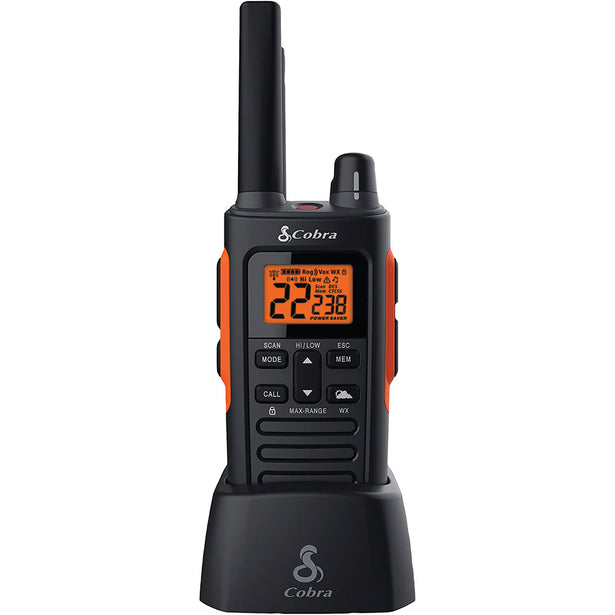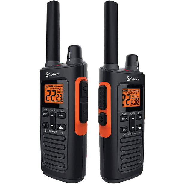 The Cobra RX680 contains a pair of a rugged, waterproof walkie talkies that are perfect for most outdoor conditions. With up to 38-mile range, Waterproof (IP54) Rating, NOAA Weather Alerts, built-in LED flashlight, and more, the family-friendly RX680 walkie talkies are ideal for outdoor adventures.