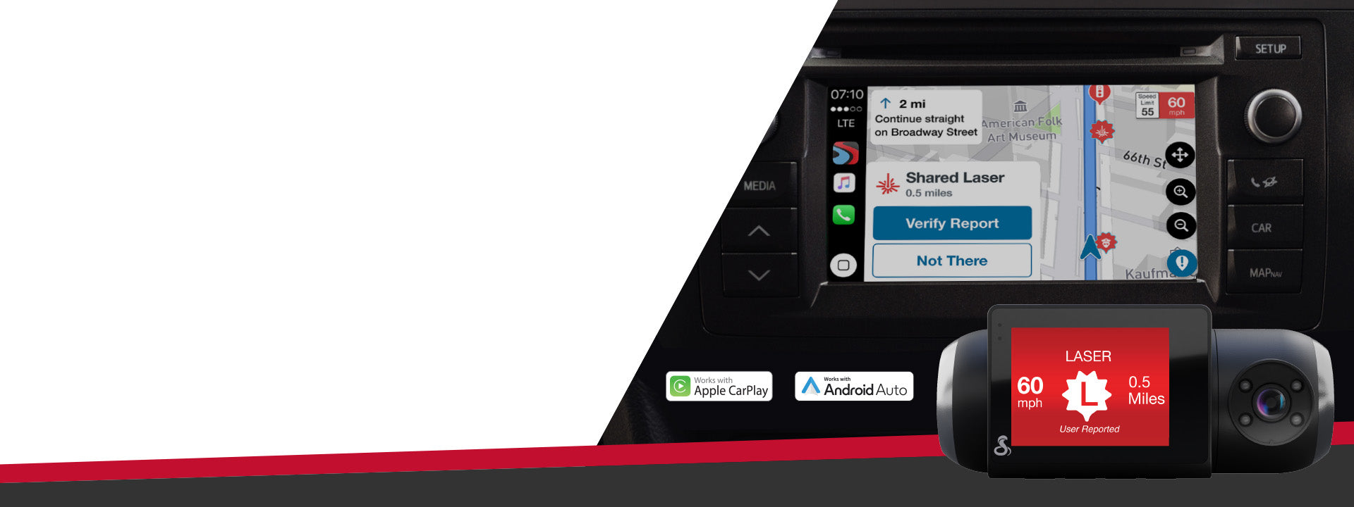 Upgrade your drive with a Cobra radar detector or dash cam and the Drive Smarter® app. Now compatible with Apple CarPlay® and Android Auto™, enjoy shared alerts, red light and speed camera locations, and real-time road conditions on your Apple CarPlay or Android Auto-enabled display.