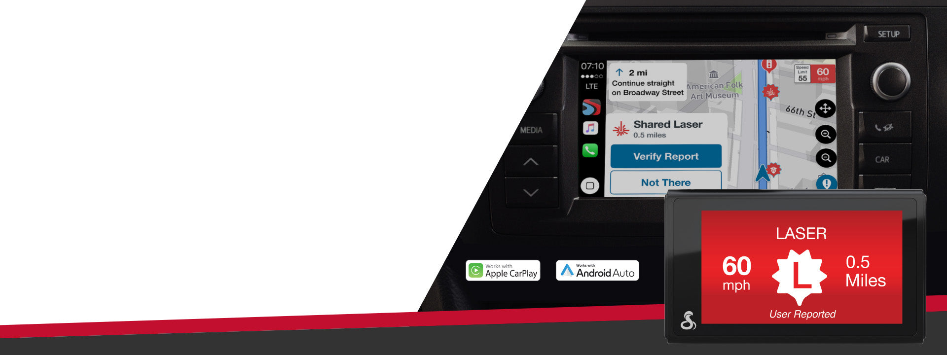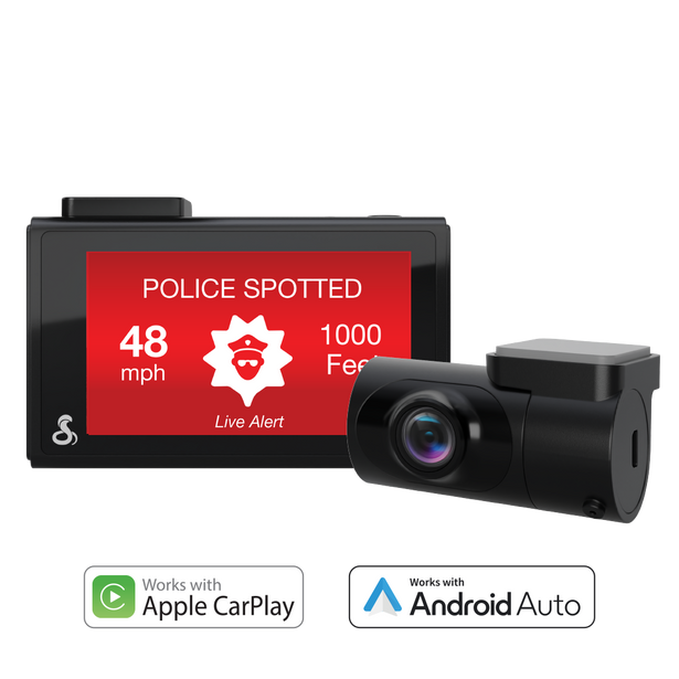 Upgrade your drive with a Cobra radar detector or dash cam and the Drive Smarter® app. Now compatible with Apple CarPlay® and Android Auto™, enjoy shared alerts, red light and speed camera locations, and real-time road conditions on your Apple CarPlay or Android Auto-enabled display.